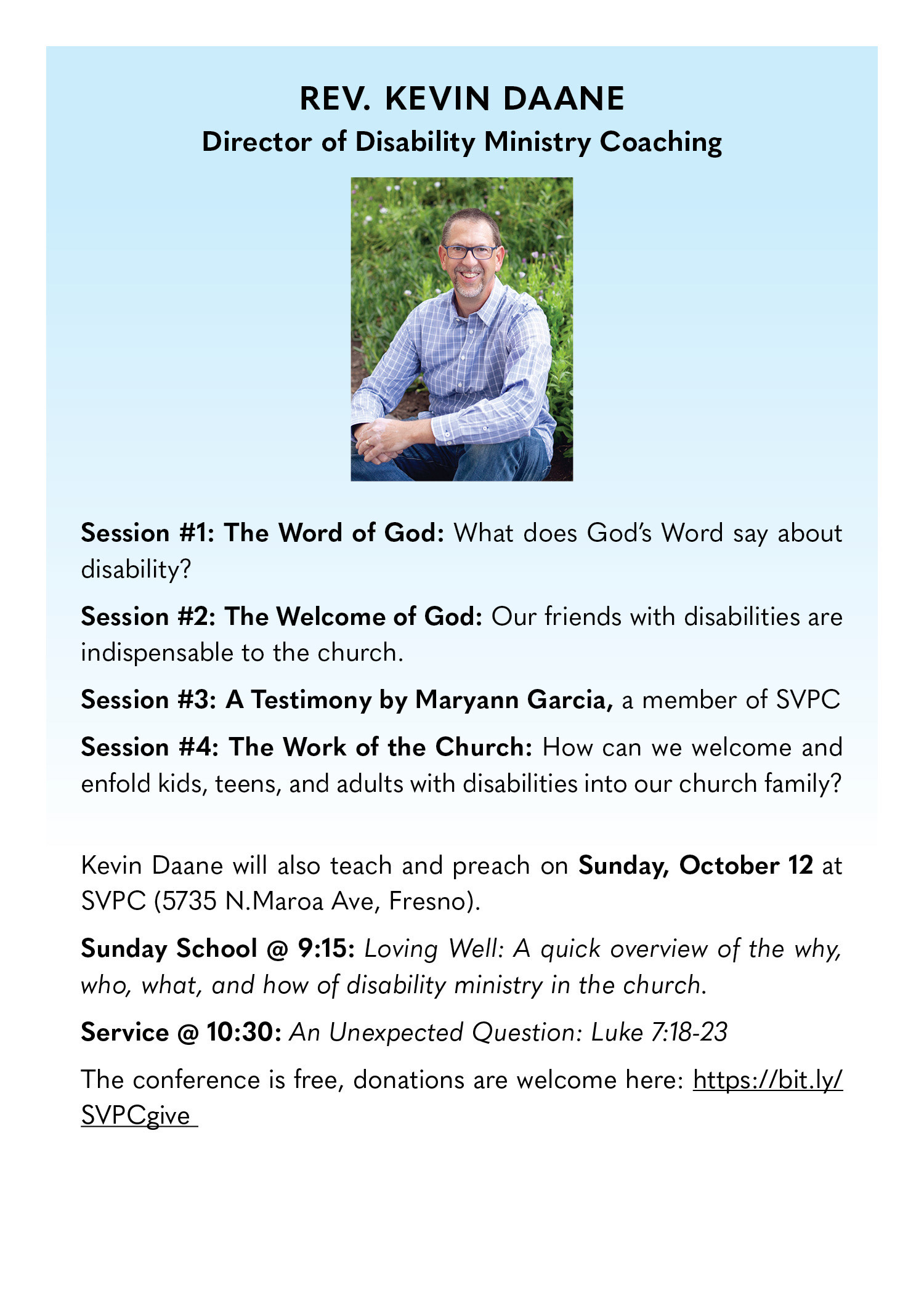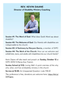 perspective on disability as well as addressing the church’s role in welcoming those with disabilities into the full life of the church. He will be joined by Maryann Garcia, a member of SVPC, who will talk about her own experiences as a Christian with a disability. We are excited to learn and discuss together, and we hope you will be blessed by attending!